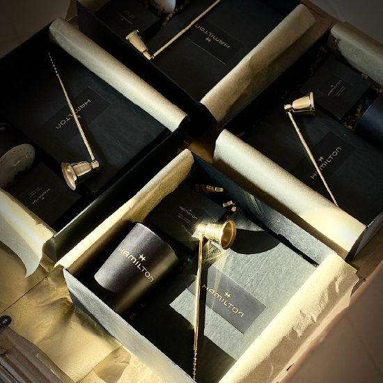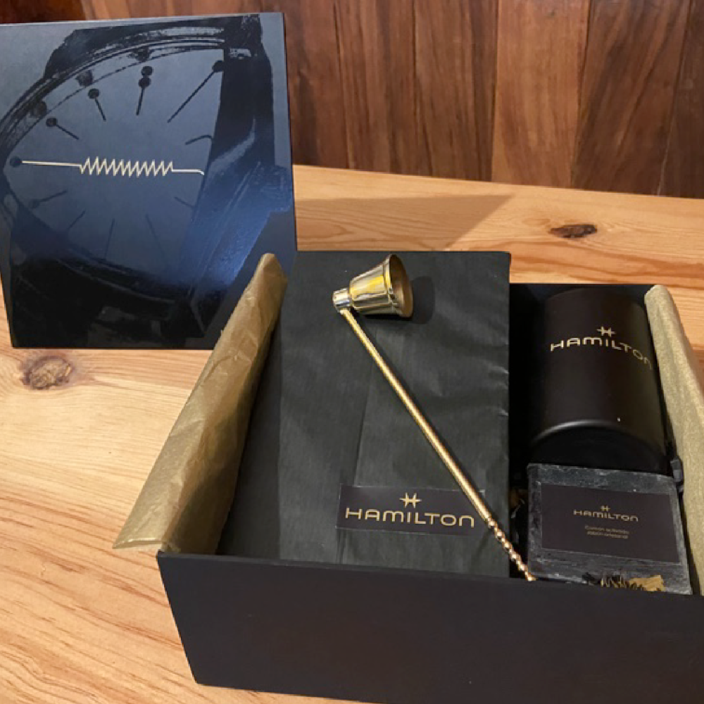Hamilton nos solicitó diseñar y producir un kit de prensa, a través de una propuesta que reflejara la elegancia de esta marca, integrada por diferentes artículos. El kit se conformó de una caja diseñada por Dopamina A2, producida en madera y serigrafía, apagavelas, velas y jabones personalizados. Para distribuirse entre influencers y representantes de prensa.